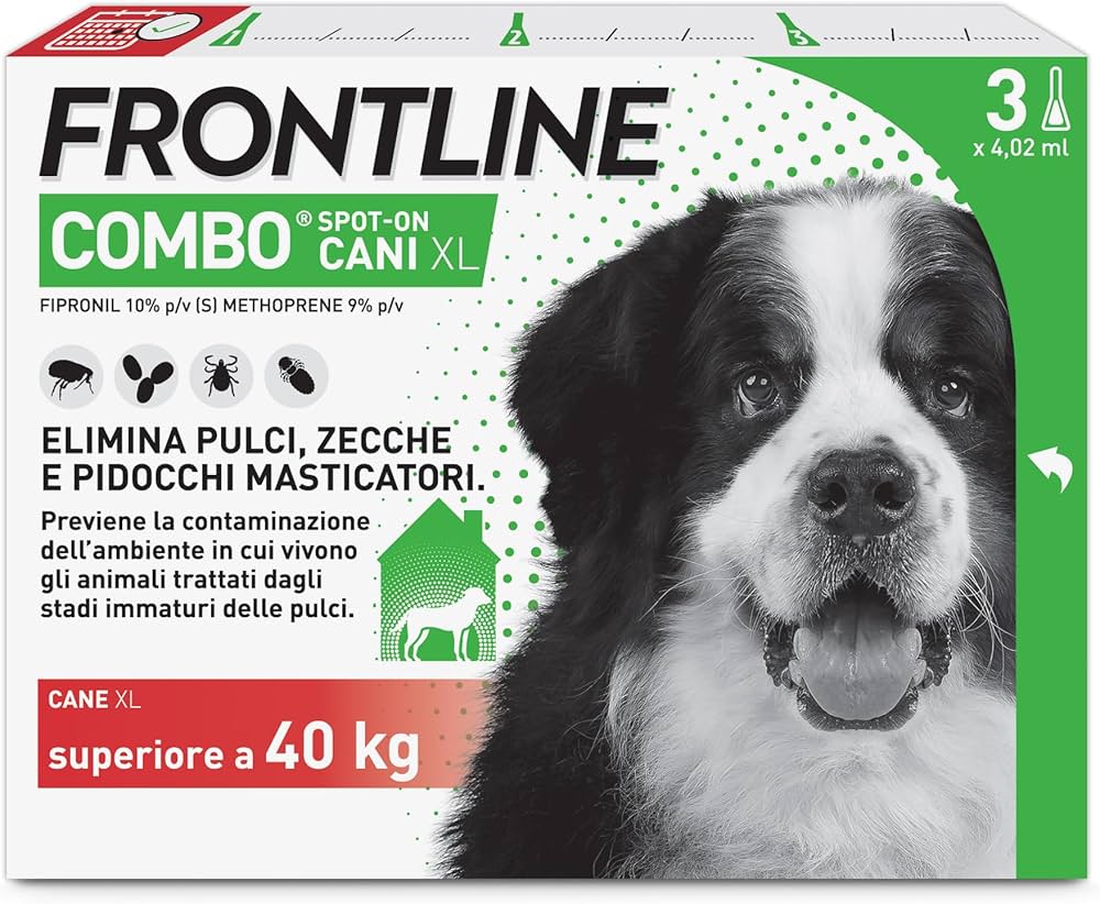 Frontline Combo è un antiparassitario spot-on in pipette, facile da applicare, progettato specificamente per cani di peso superiore ai 40 kg. Questa formulazione combina Fipronil e (S)-Methoprene, due principi attivi sinergici che offrono una doppia azione protettiva: non solo elimina i parassiti già presenti sull’animale, ma impedisce anche la proliferazione nell’ambiente domestico.