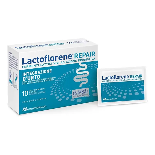 Montefarmaco Lactoflorene Repair è un integratore di fermenti lattici probiotici vivi, utile per favorire il benessere gastrointestinale. La flora batterica intestinale può ritrovarsi alterata a causa di diversi fattori come: intolleranze e disordini alimentari, cure antibiotiche, virus intestinali, stili di vita scorretti.